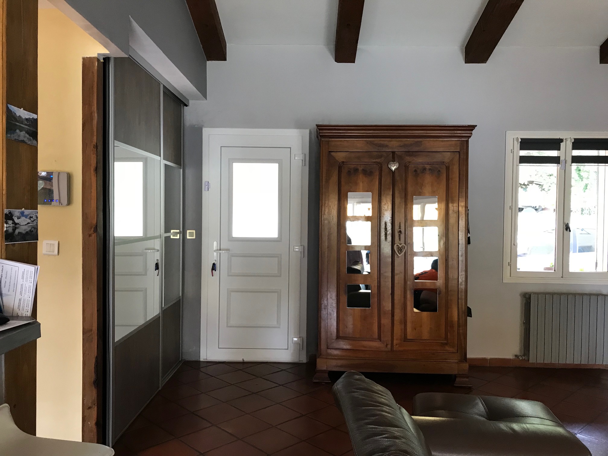Tout un pan de mur a donc été imaginé intégrant le poêle, des rangements et des éléments décoratifs dans les tons verts Céladon. Pour agrémenter et optimiser l’espace, un meuble d’entrée menuisé a été proposé.