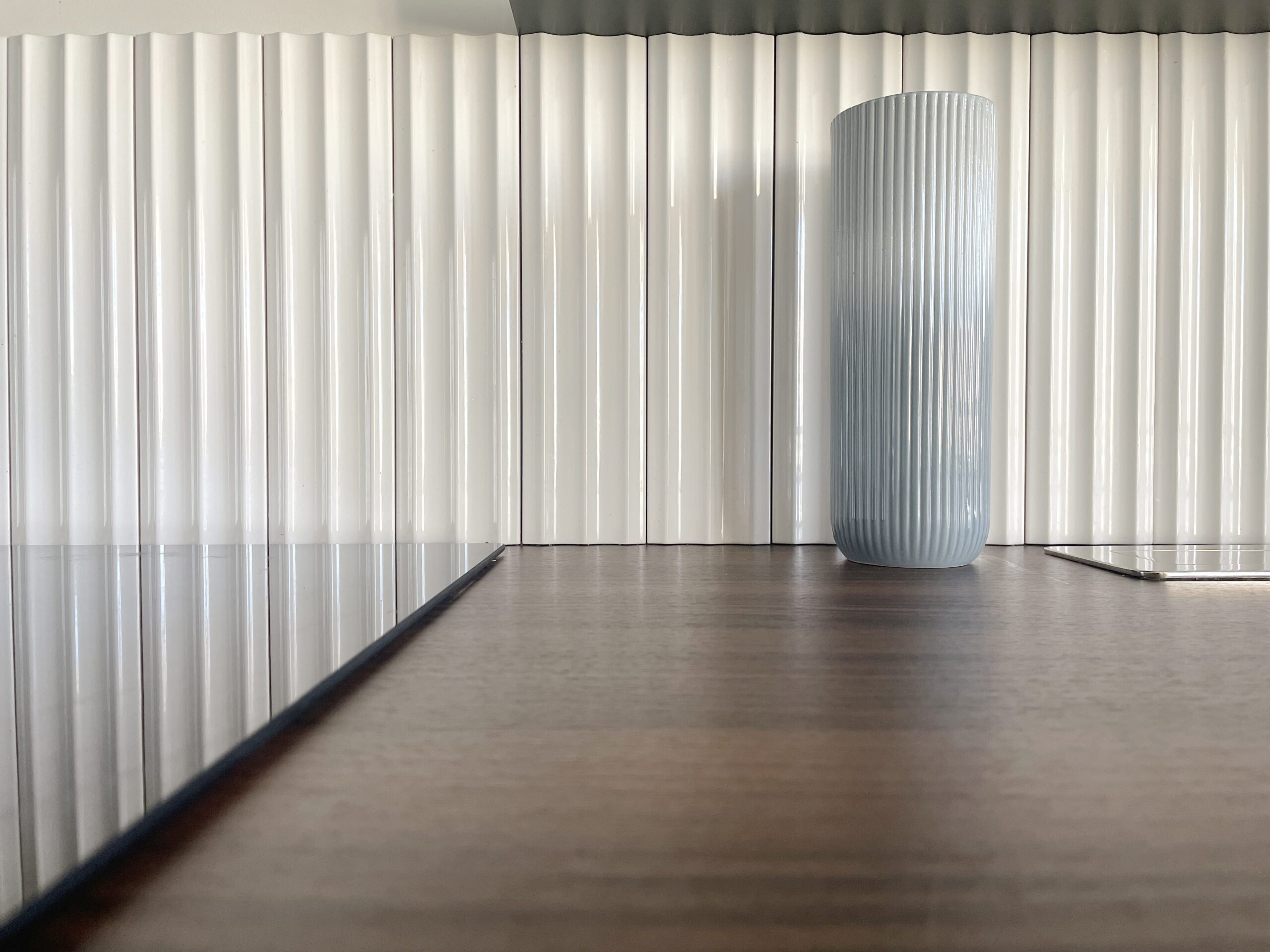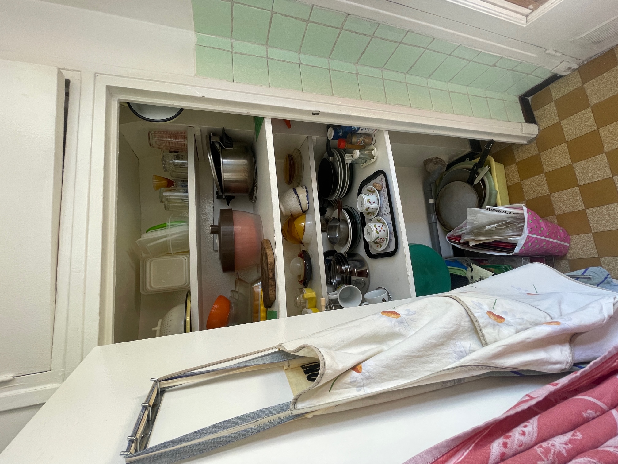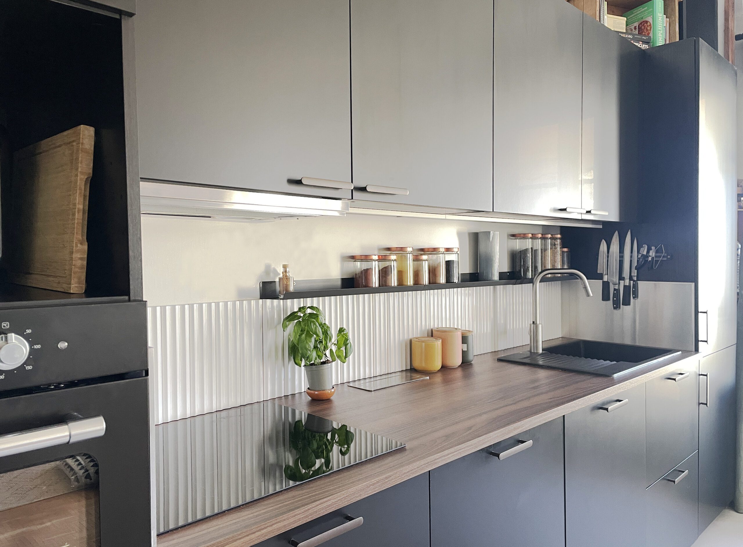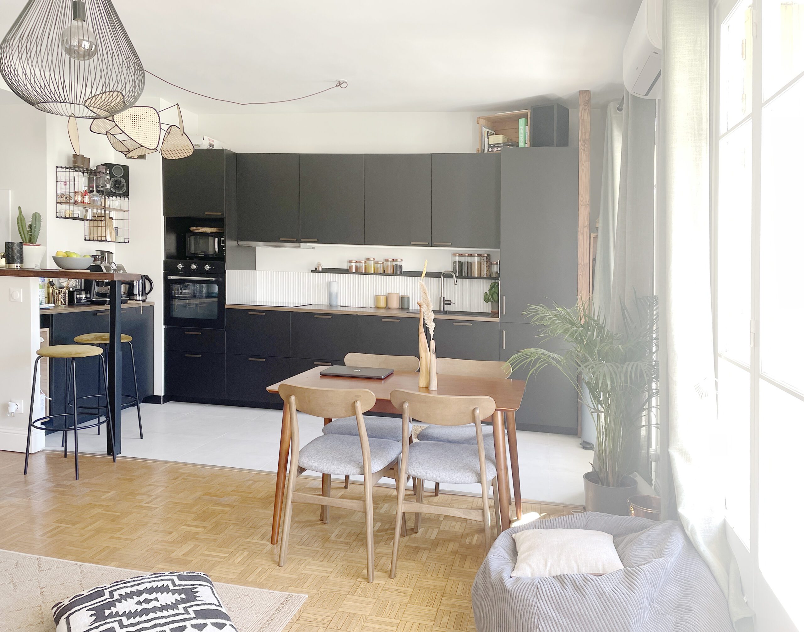 Afin d’ouvrir l’espace et de créer une pièce de vie spacieuse et agréable, la cloison de l’entrée et de la cuisine ont été démolies, ainsi que le placard.