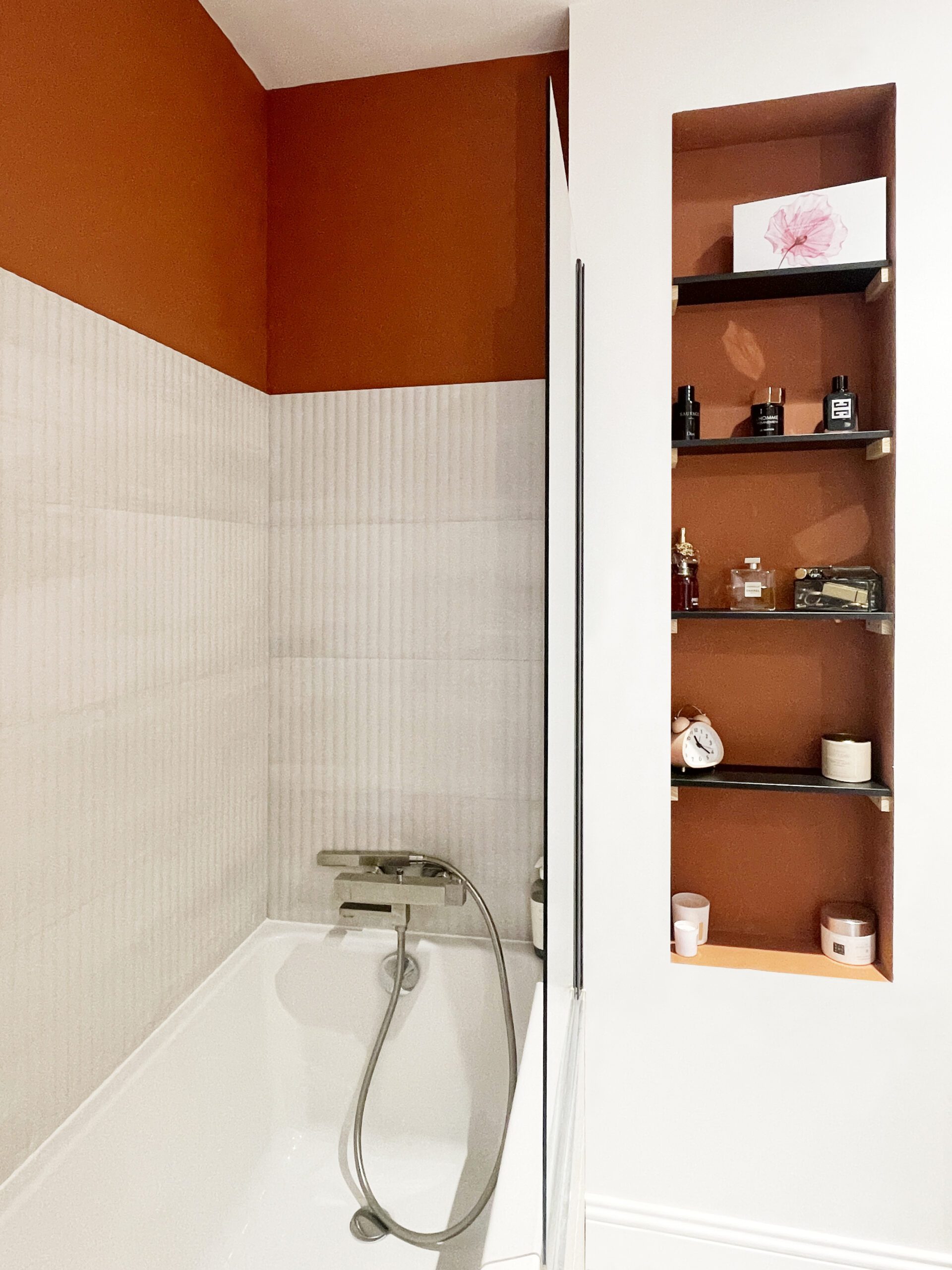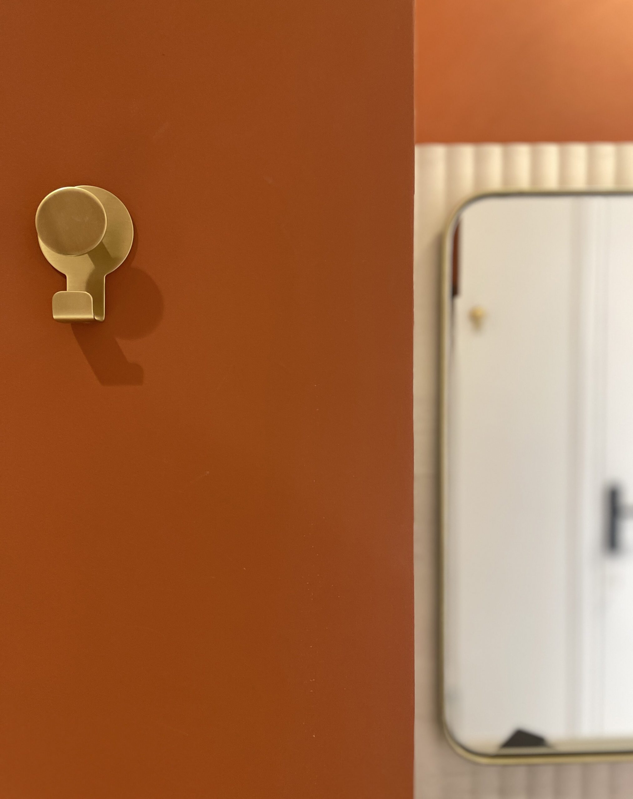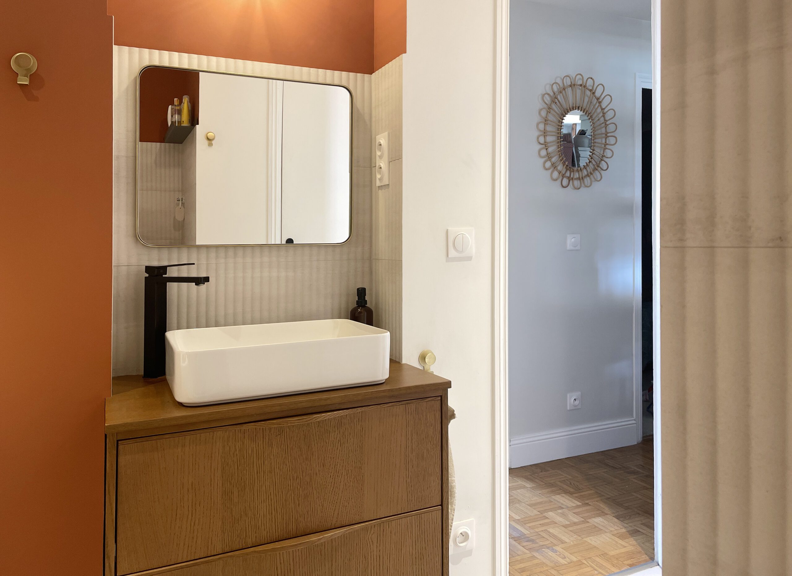 Les sanitaires et la salle d’eau, unis par un ocre profond, ont été modifiés pour être fonctionnels, optimisés et esthétiques.