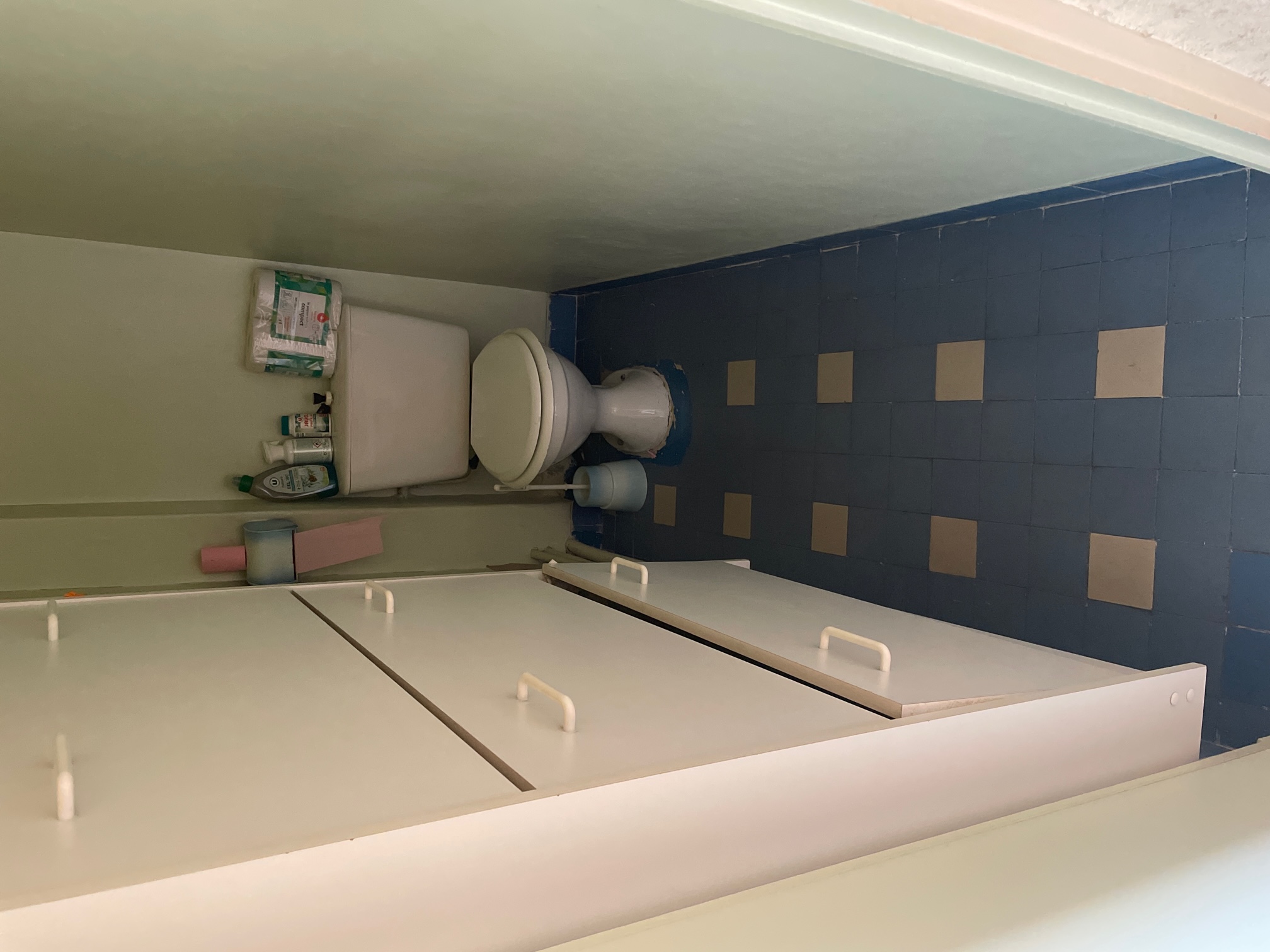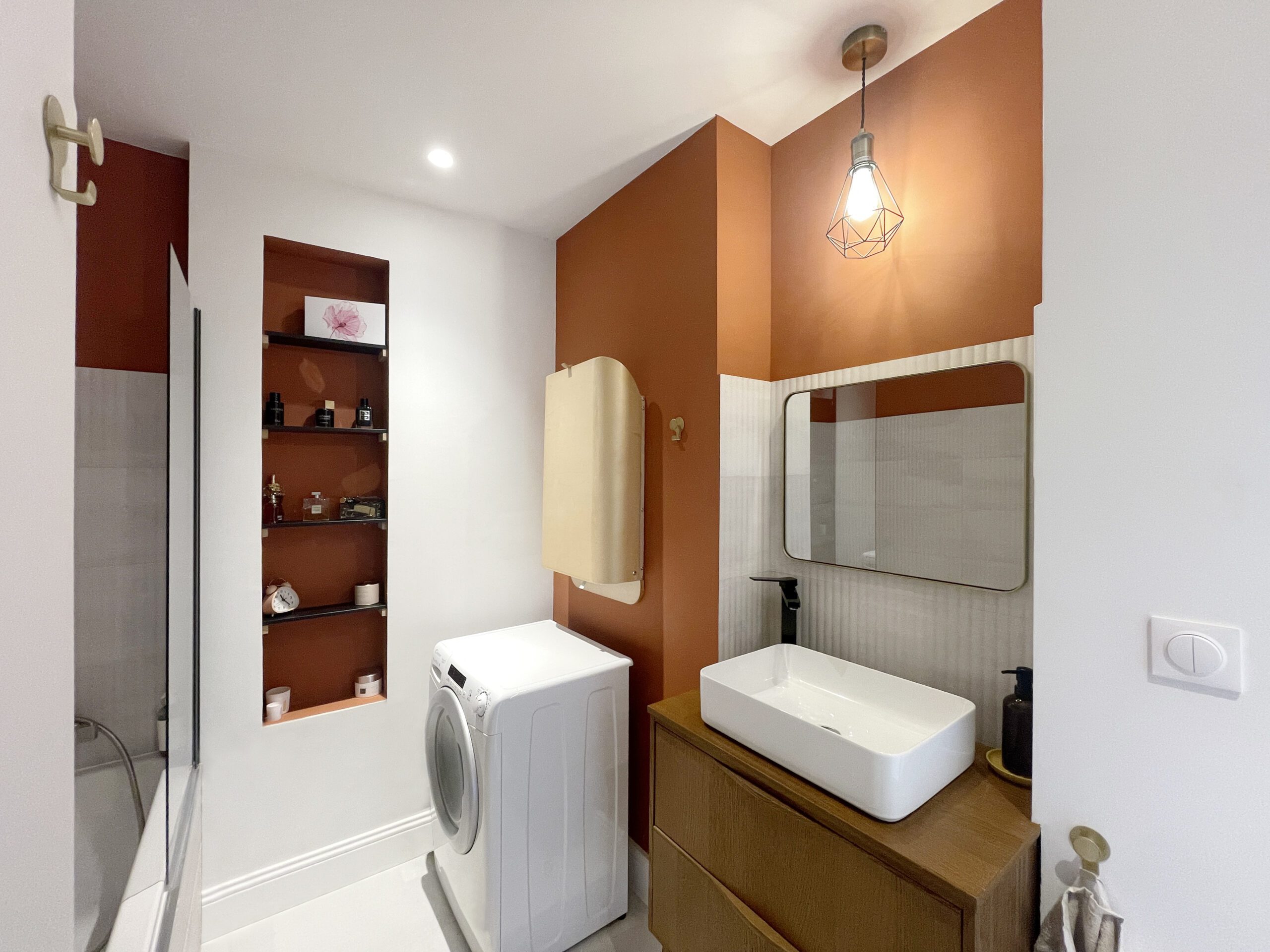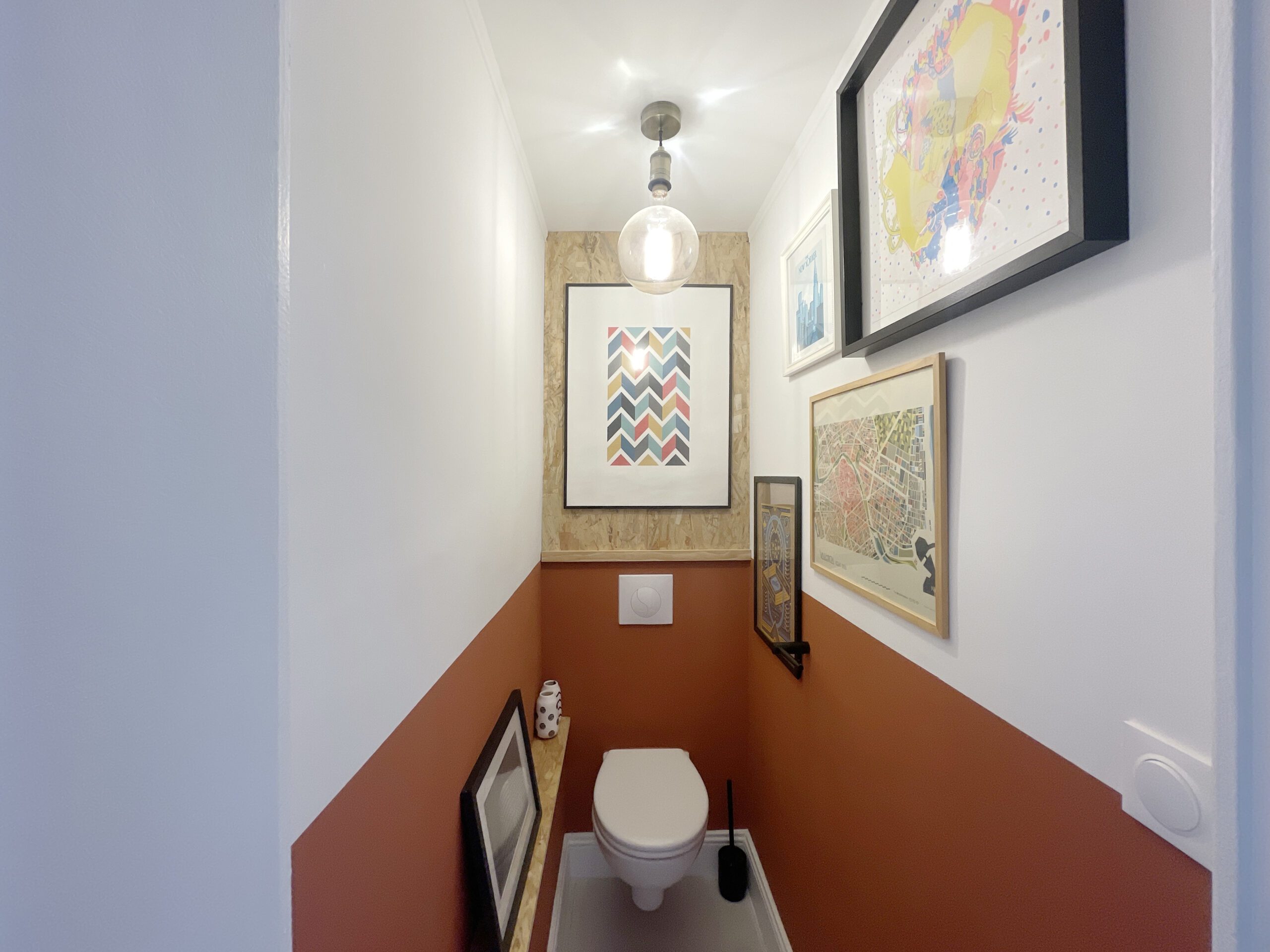 Les sanitaires et la salle d’eau, unis par un ocre profond, ont été modifiés pour être fonctionnels, optimisés et esthétiques.