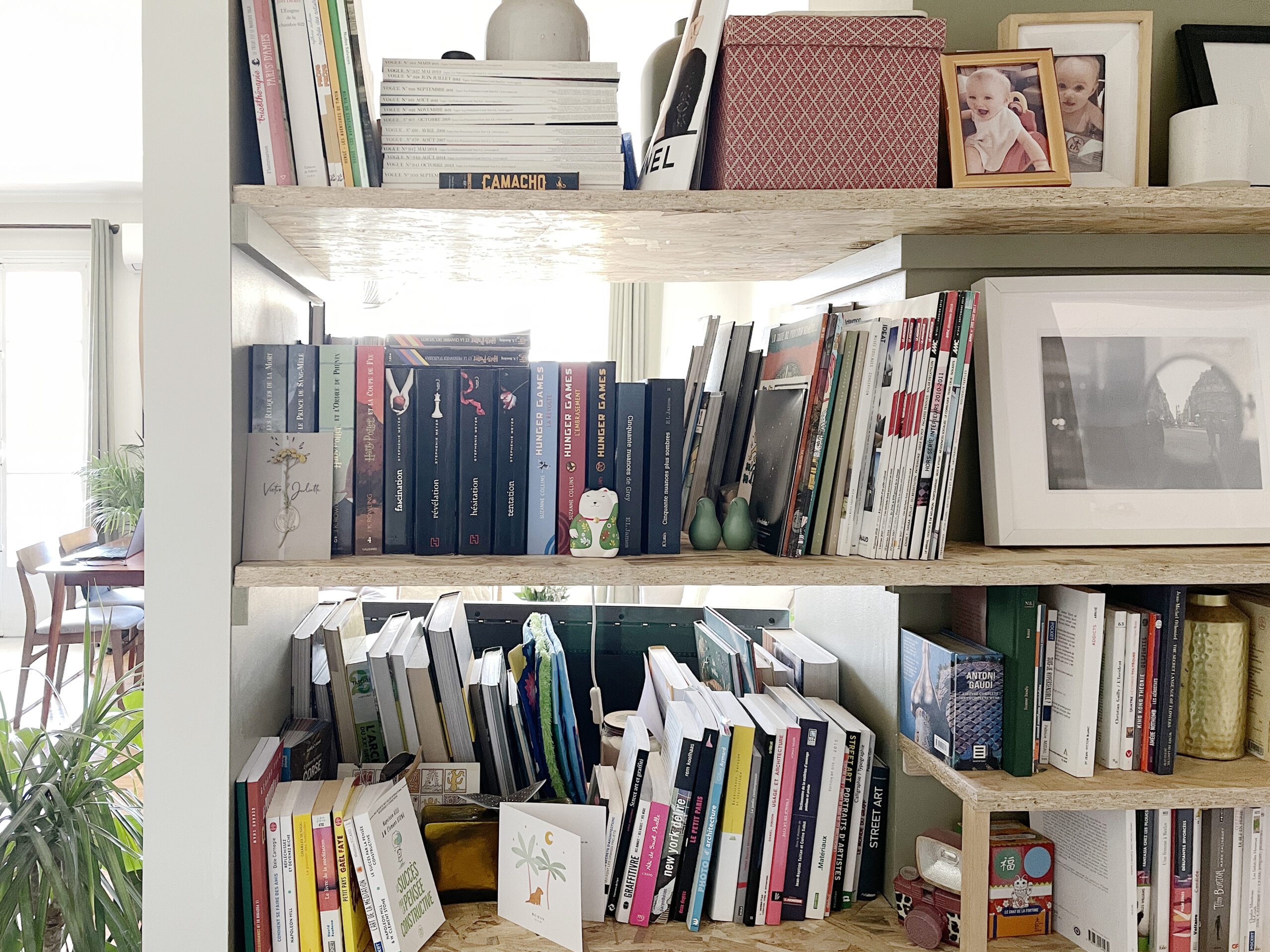 La cuisine, point central du lieu, est noire mate ; elle donne sur un séjour agréable et très lumineux. Une bibliothèque ouverte sépare le coin jour du coin nuit tout en laissant pénétrer la lumière de toutes parts.
